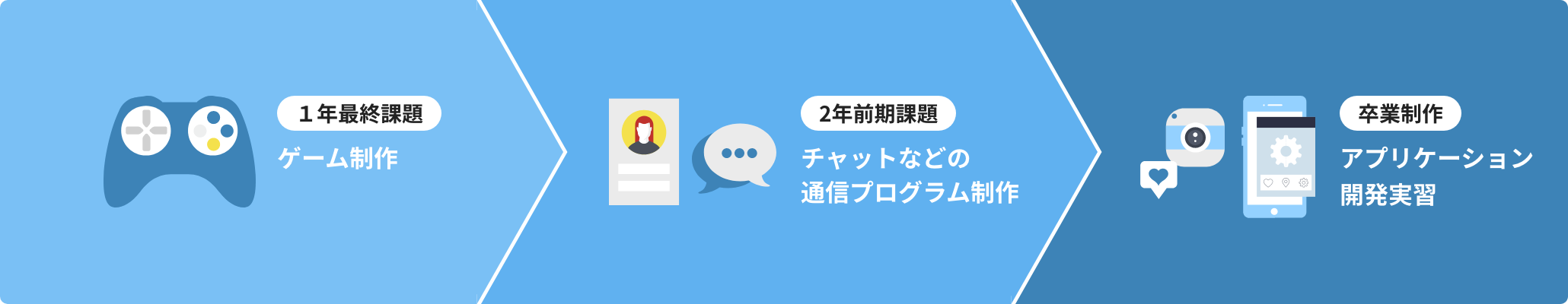 ゲーム開発実習を通じて、ビジネス系から制御系まで応用範囲の広いJava言語を主体に、社会で活躍できる高いプログラミング技術を幅広く身につけることができます。