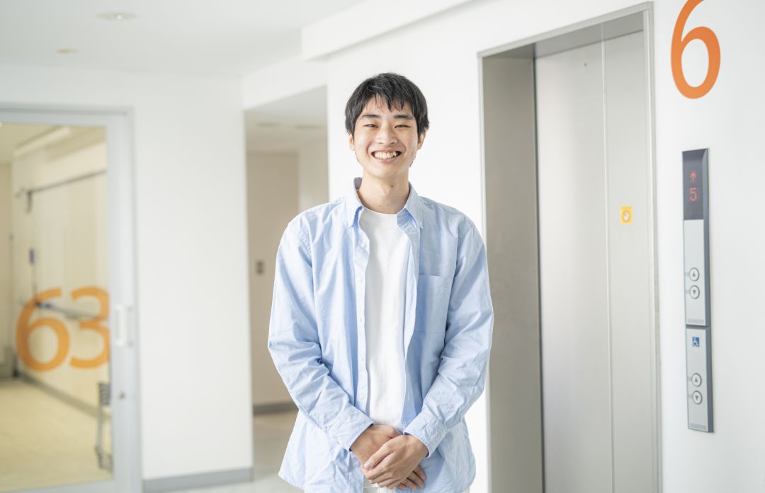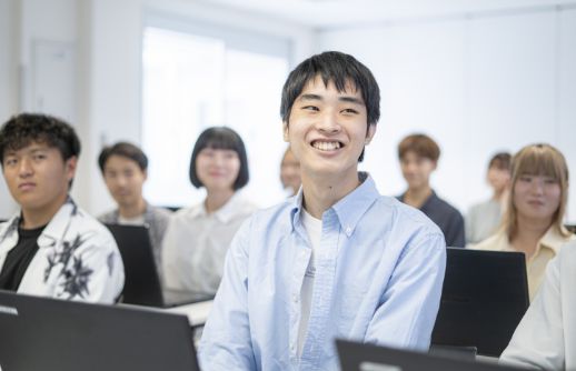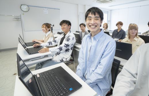 「好きな授業はJava言語実習とモバイルプログラミング実習です!プログラミングの専門知識を深めながら、日々充実した学校生活を送っています。」SEプログラマーコースで専門知識を勉強中の笑顔いっぱいの荊尾くんの1日に密着!