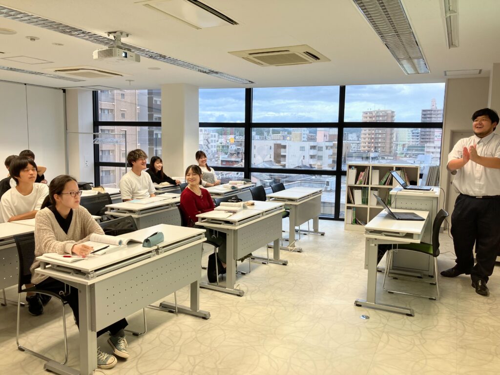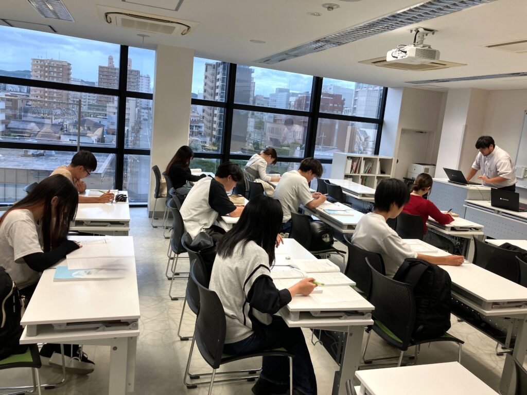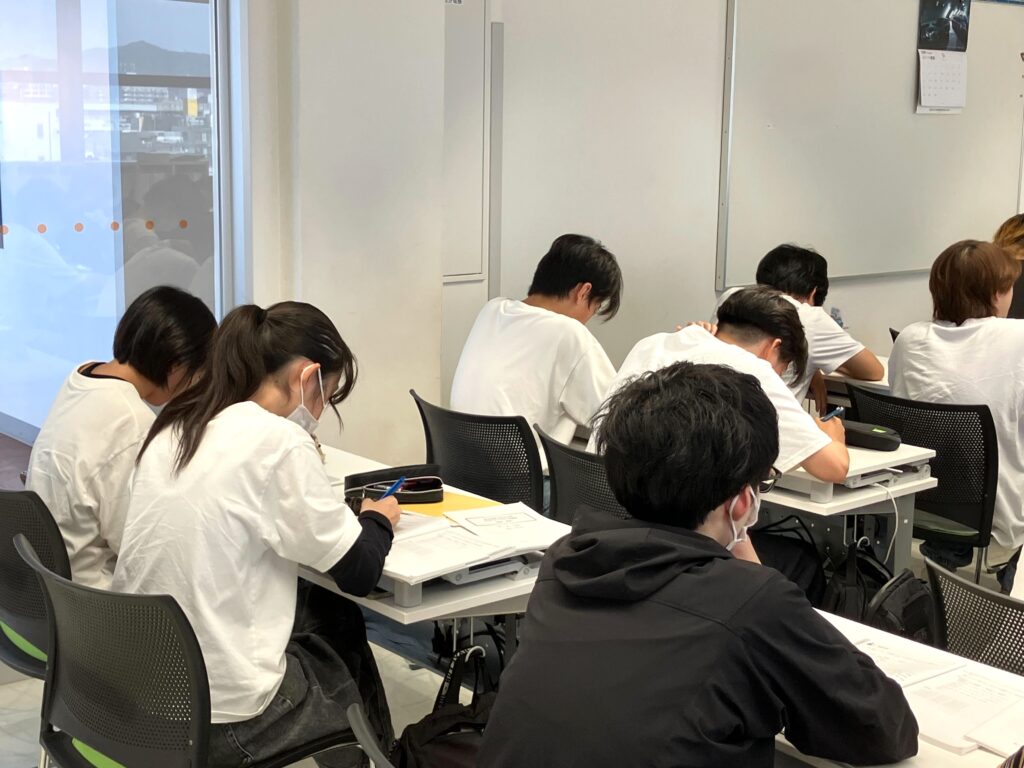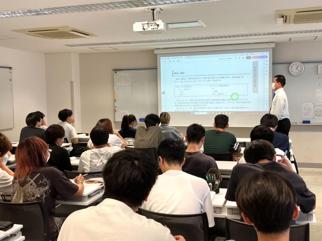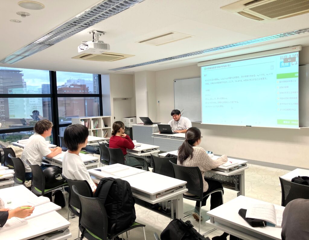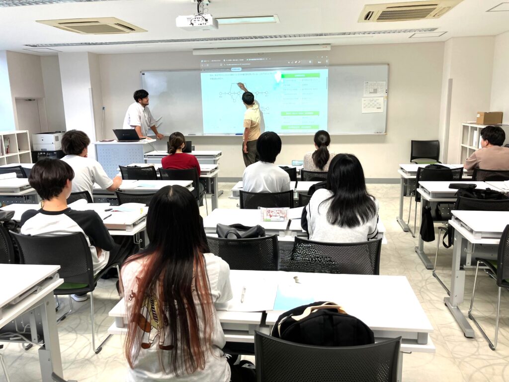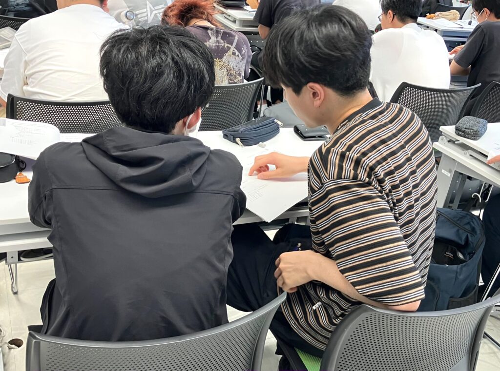 まずは各自で問題に挑戦。分からない時は先生に個別で質問し、皆がつまずきやすい問題は、全体で解説していきます。解説の場では学生が「分からない」を素直に発言でき、間違いも共有しやすい雰囲気。時には先生が場を和ませながら進めていました。