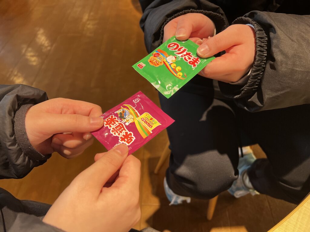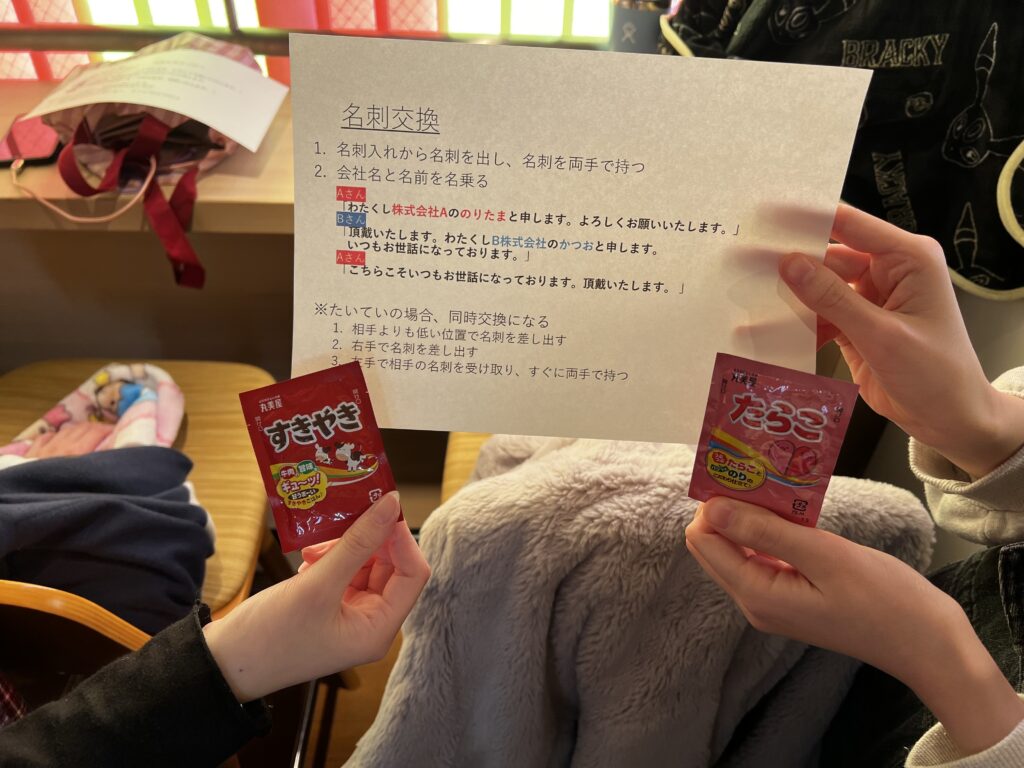 ふりかけを名刺に見立てて交換をしたり、お手製の電話機で応対練習をしたり、Himejoの医療コースらしさが溢れる研修でした。