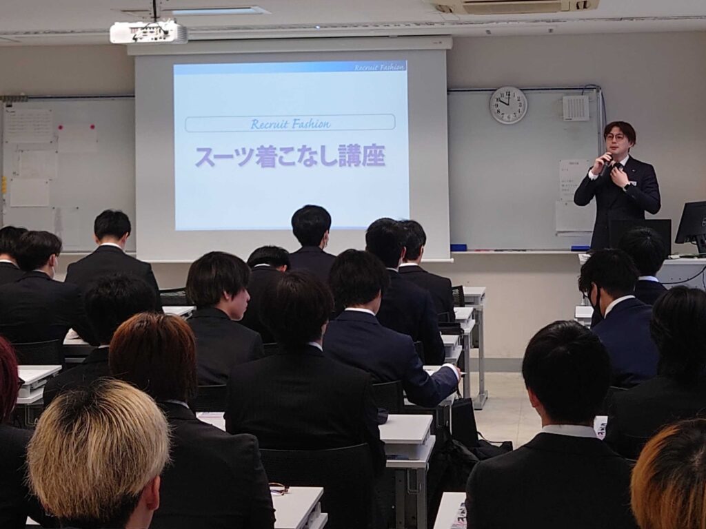男子学生は、スーツの着こなし講座に参加しました。ビジネスウェアを扱う企業様を講師に迎え、第一印象を左右するスーツの正しい着方や、ネクタイの結び方について丁寧な解説を受けました。