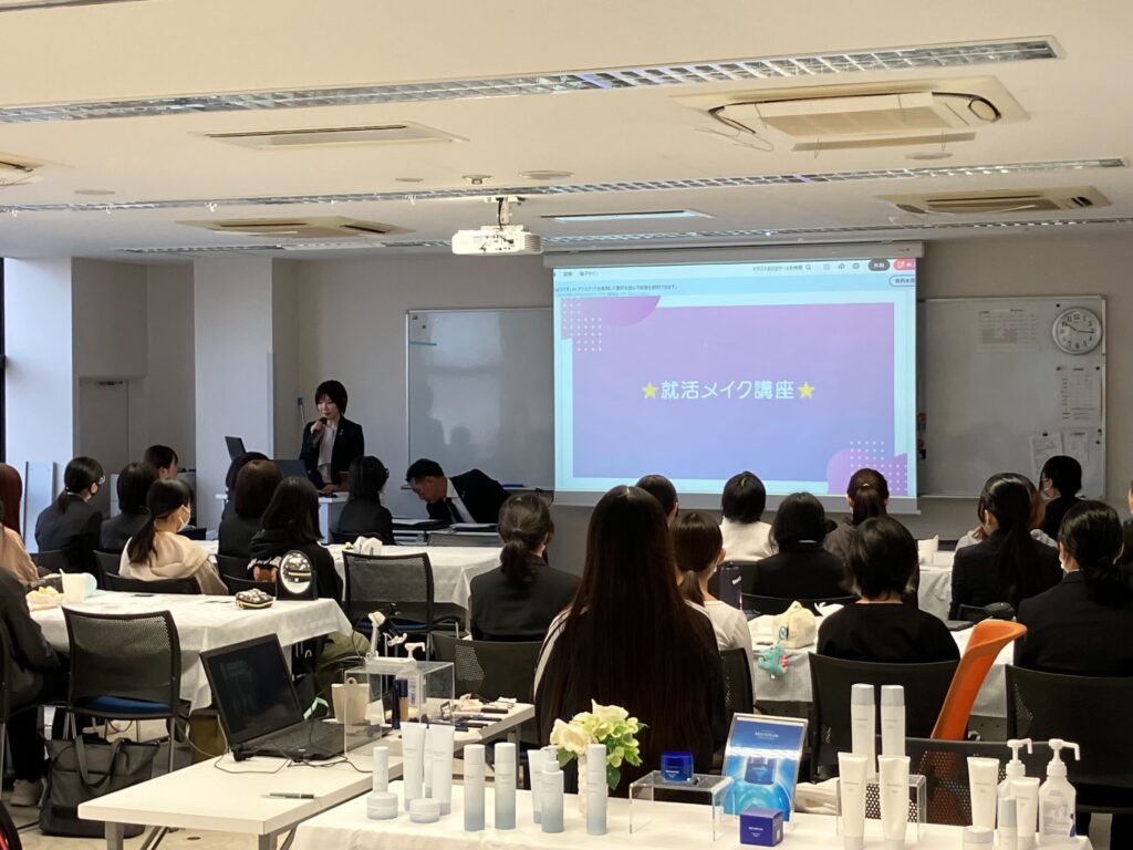 女子学生向けには、コスメを扱う企業様を講師に迎え、就職活動に向けたメイク講座を実施。講座の冒頭では、「第一印象の大切さ」や「就職活動にふさわしいメイクとは何か」について、スライドを用いて分かりやすく説明していただきました。