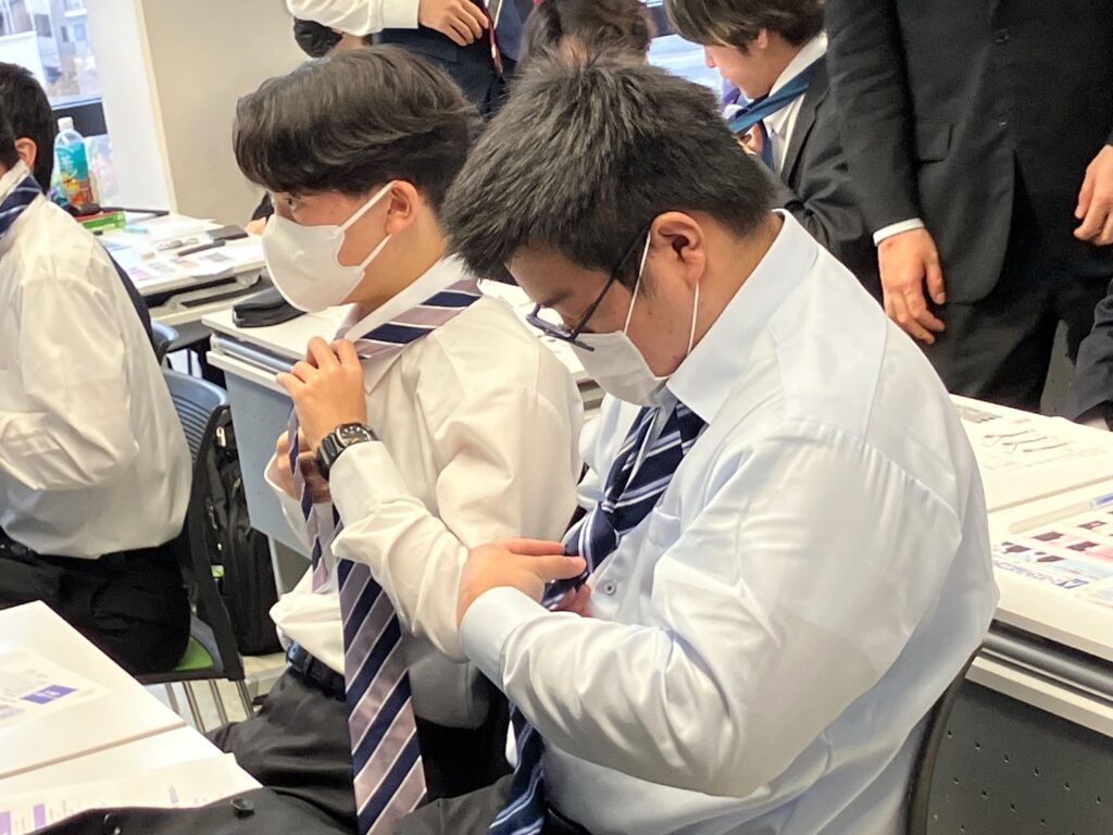 実際にネクタイを結びながら確認する場面では、学生同士で教え合ったり、講師の方の手元を真剣に見つめたりと、教室内にはほどよい緊張感が漂っていました。慣れない手つきながらも、何度も結び直しながら形を整えようとする姿が印象的で、少しずつ社会人としての意識が芽生えてきたように感じられます。